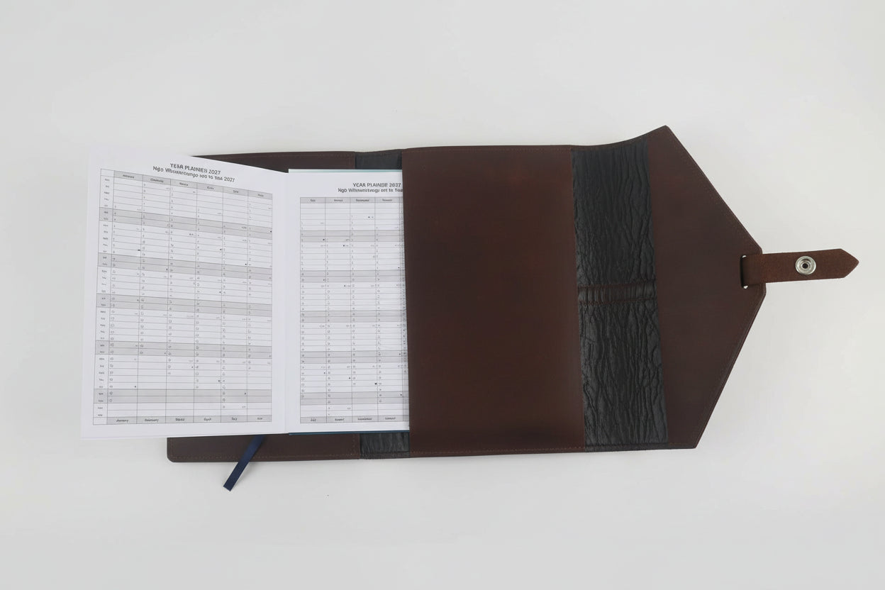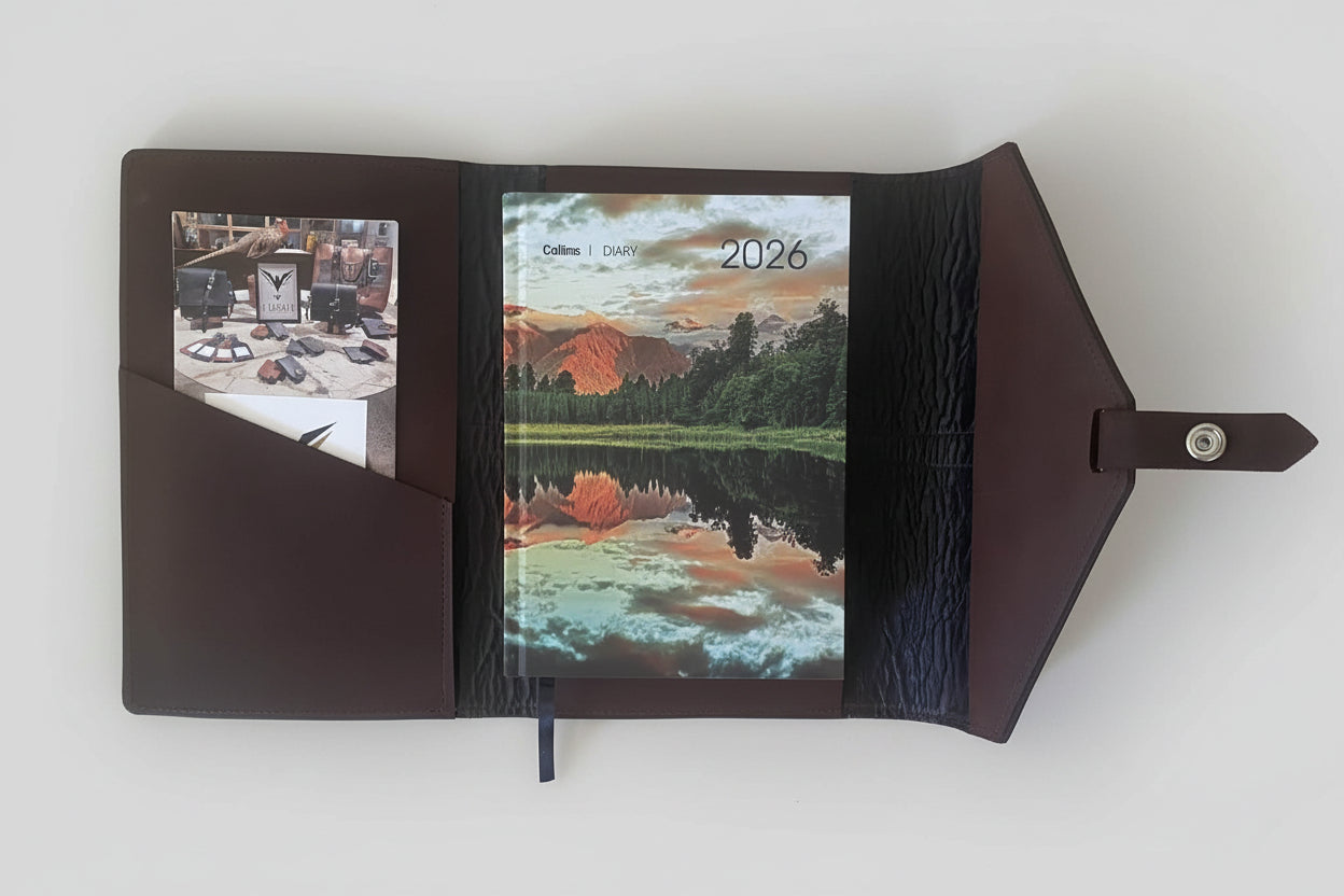 The Barakat luxury leather diary case is designed to hold an A5 diary, pen, multiple cards, letters, tickets, and important papers. Made from the highest quality NZ leather and hand crafted in New Zealand this unique case will only get better with age. These are timeless workplace essentials and meaningful corporate gifts as they can be laser engraved with a business logo or embossed with personalised initials.